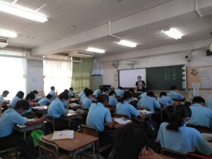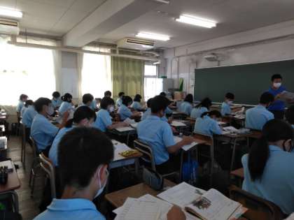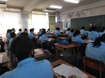 教科書を使って、担当の先生からのお話や質問に答えています。