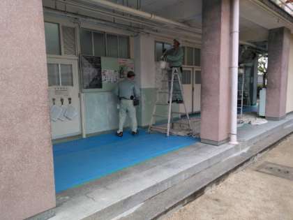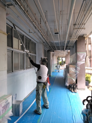 本日も営繕班の皆様、管理作業員さんが一階廊下の塗装作業を行ってくださっています。