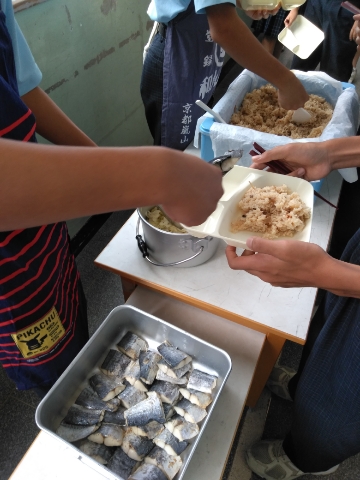 本日のメニューは「かやくご飯」「さごしの塩焼き」「豚肉と野菜の煮物」「キャベツの梅風味」です。