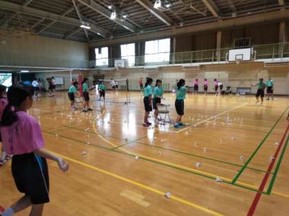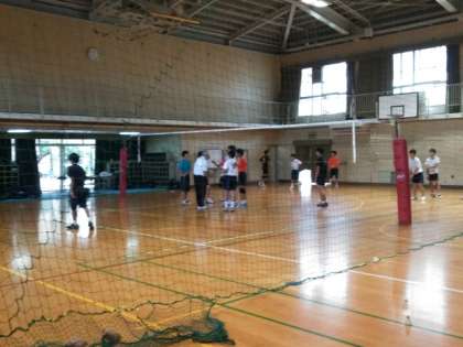 体育館では、バドミントン部と男子バレー部が練習しています。