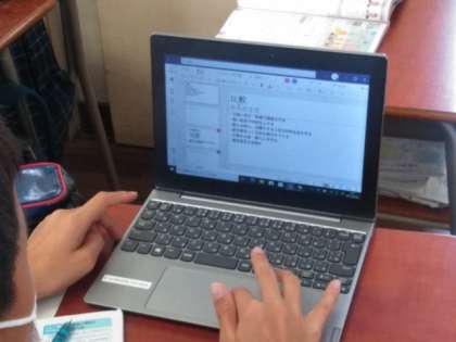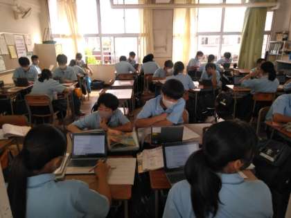社会科の時間。一人一台端末を活用し、政党について調べ学習を行っています。