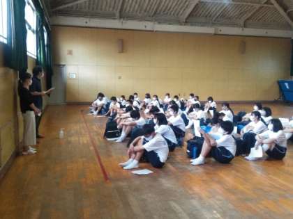 挌技室では卓球部が練習後のミーティング中、
