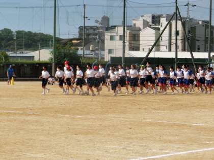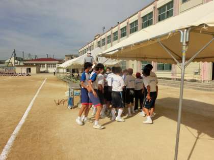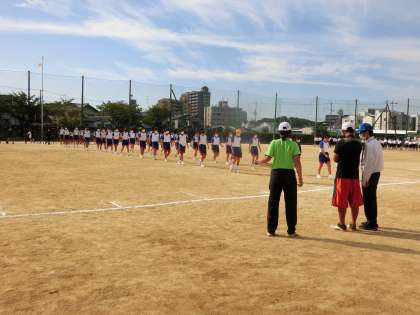 リレーチームの入場、そしてゼッケンの受け渡しです。