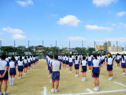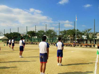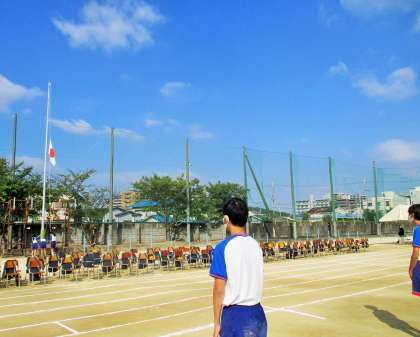 全校生徒がグラウンドいっぱいに整列し、吹奏楽部による演奏の中、国旗が掲揚されました。