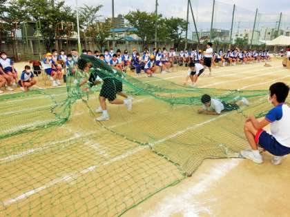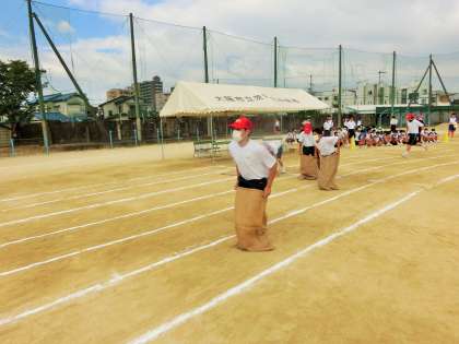 縄跳び、麻袋(ドンゴロス)、ネットくぐりと関門が待っています。