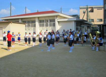 校歌を吹奏楽の演奏で、校旗掲揚です。