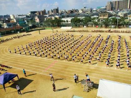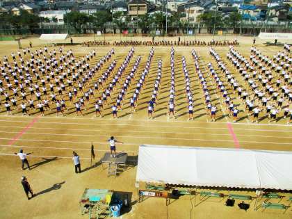 各学年の生徒席から入場し、全校生徒がグラウンドいっぱいに広がりました。