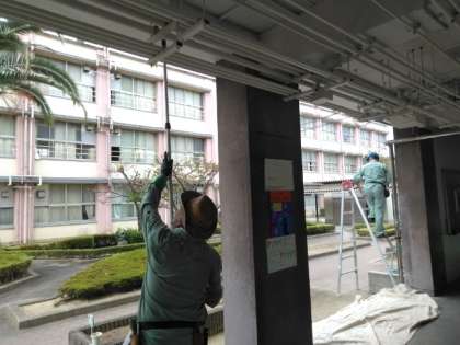 管理作業員さんが廊下天井の塗装作業を行っています。