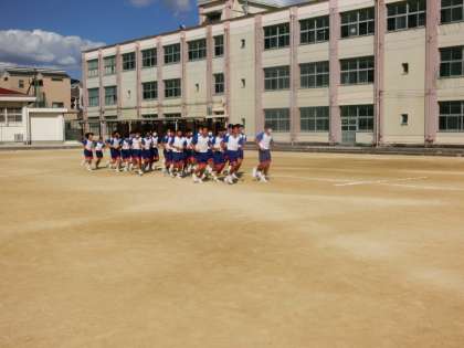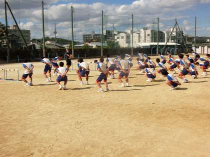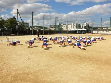 5限の予鈴から授業が始まり、ランニング、ラジオ体操の後、腕立て伏せなど補強運動が行われました。