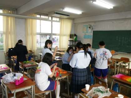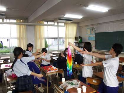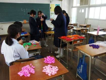 今日は、学年のみんなで折った折り鶴を集め、千羽鶴を作成しました。