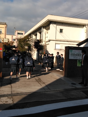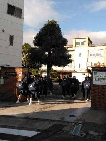 太陽が輝く中、児童さん、生徒たちが登校してきました。