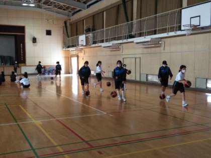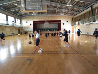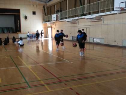 体育館で、バスケットボールの授業です。