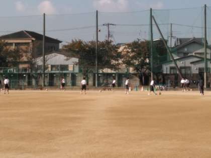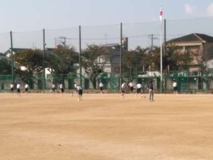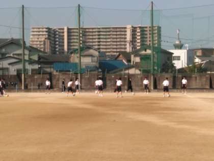 男子はグラウンドで、サッカーの授業です。