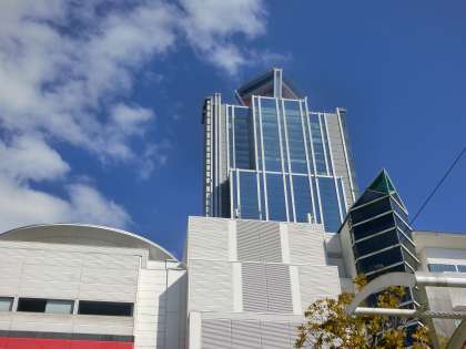 南港の象徴、高くそびえる咲州庁舎。