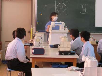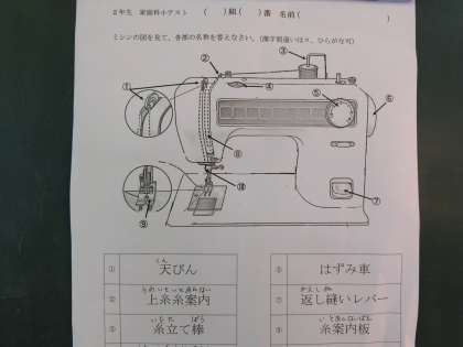 リバーシブルのランチョンマット作成に向けて、裁縫ミシンの使い方を学びます。