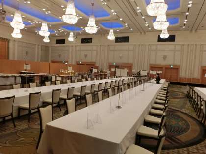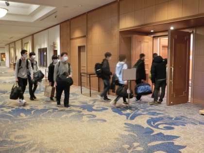 帰る用意をして荷物を背負い、食事会場に集まってきました。