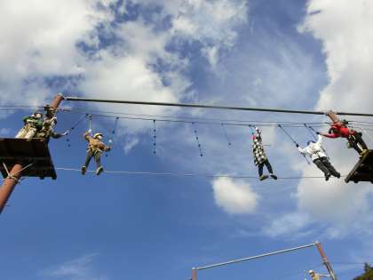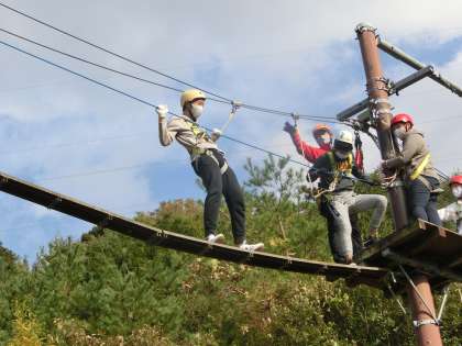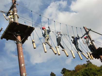 命綱とロープをつかみ、丸太や板、ロープの上を散歩して行きます。