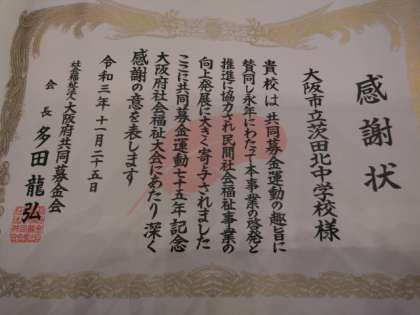 本校は、緑中学校、汎愛高校、茨田北女性会ともに、感謝状をいただきました。