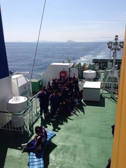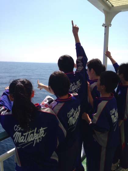 フェリーは、壱岐水道を北上しています。みんな、船上で楽しんでいます。