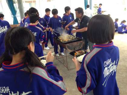 浜の近くでバーベキューをしています。調理は、今晩、お世話になる民宿の方です。
