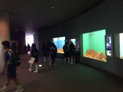 午後の展示見学をしています。写真は水族展示室での様子です。