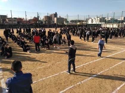 少し暖かくなったグラウンドで、災害についての講話を行いました。