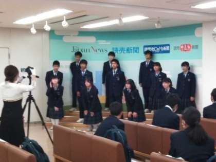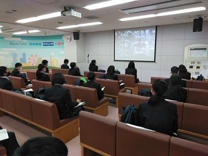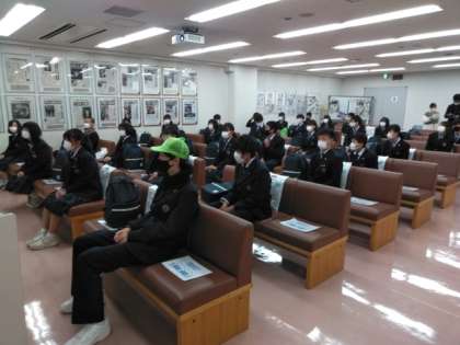 社内に入って、記念写真のあと、新聞づくりについて、その仕事について教えていただきました。