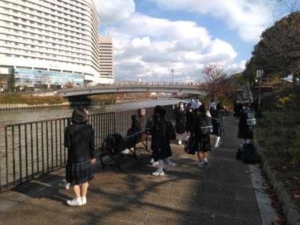 前半組の水上バス到着を待っています。