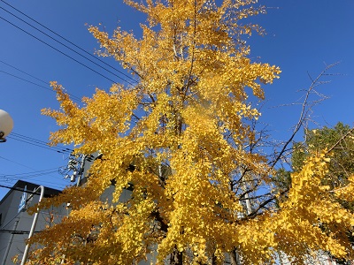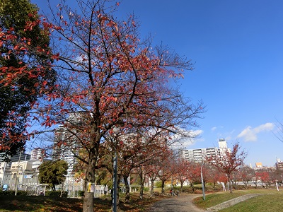 桜並木のある公園。真っ赤な葉が、だいぶ落葉しています。