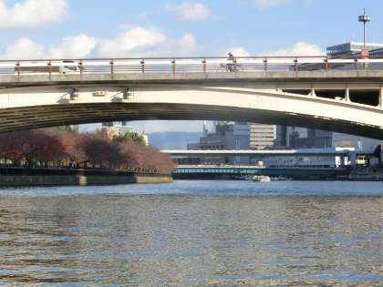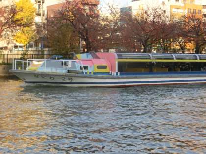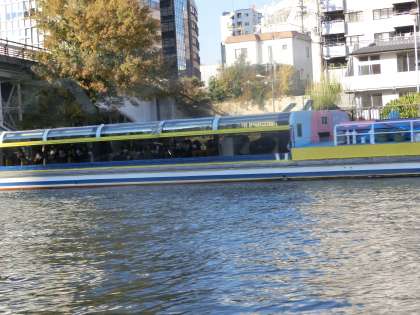 手を振る女子生徒の乗る水上バスとすれ違い、