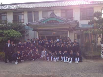 おはようございます。3年生は、各民宿で朝食を取りバスに乗りました。