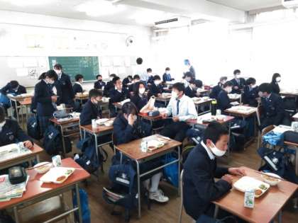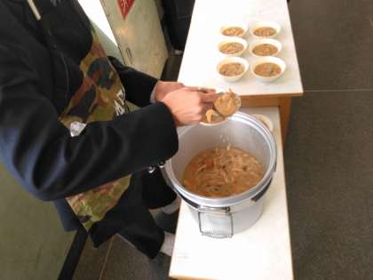 本日のメニューは、「タラのフライ」「さつまいもと薄揚げの味噌汁」「菊菜と白菜の胡麻和え」です。