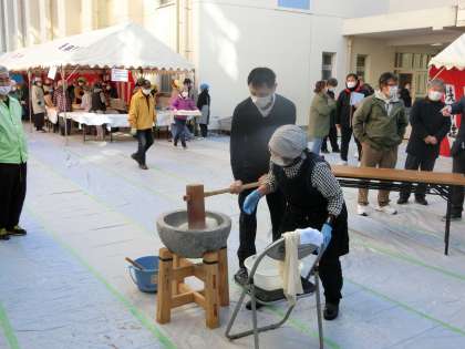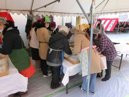 もち米を蒸しあげ、臼と杵でつき、小餅に丸める。