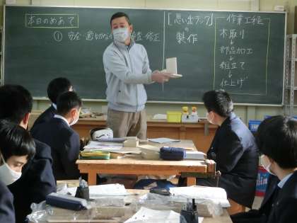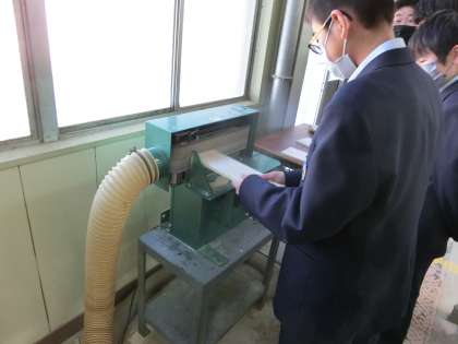 木工加工の授業で、のこぎりややすり、電動のベルトサンダーなども使います。