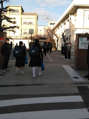 青空のもと、生徒たちは元気に登校しています。