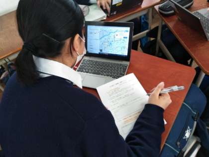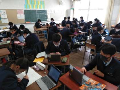 卒業前のプレゼンに向けて、3年社会科では「探求学習」が行われています。