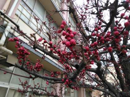 紅梅のつぼみが、パンパンに膨らんでいます。
