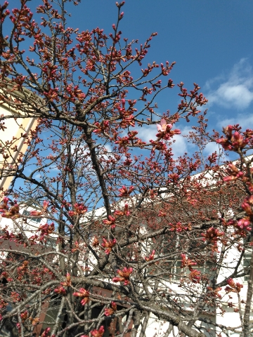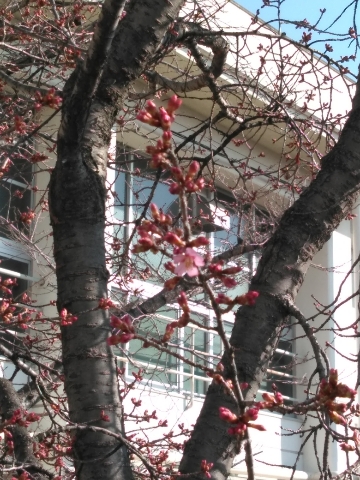 ソメイヨシノよりも一足早く、寒緋桜(カンヒザクラ)の開花が、