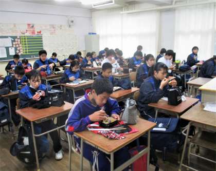 教室で昼食です。