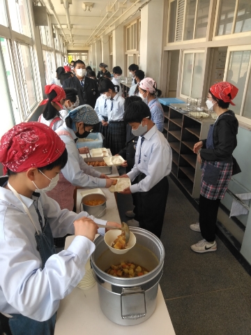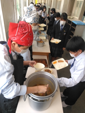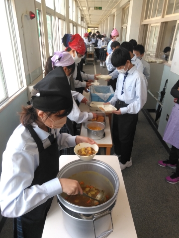 午前中の授業が終了し、給食の準備に入りました。