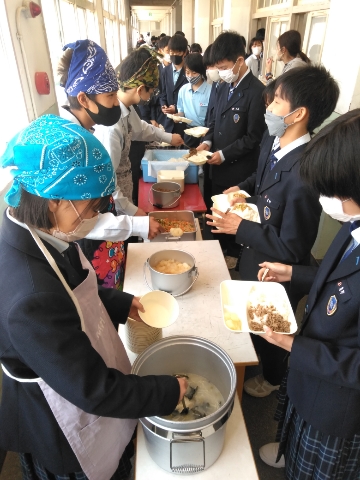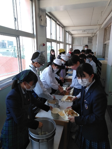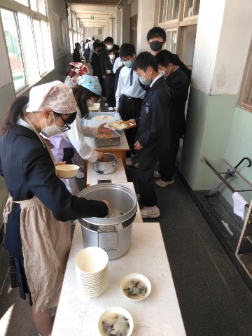 午前中の授業が終了し、給食の準備に入りました。