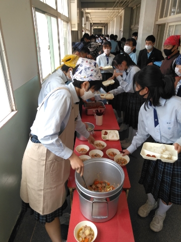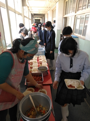 午前中の授業が終了し、給食の準備に入りました。