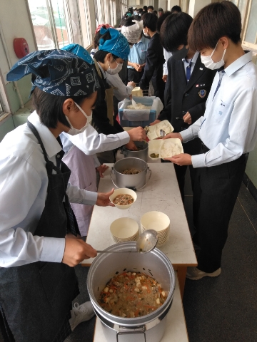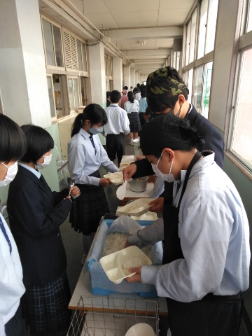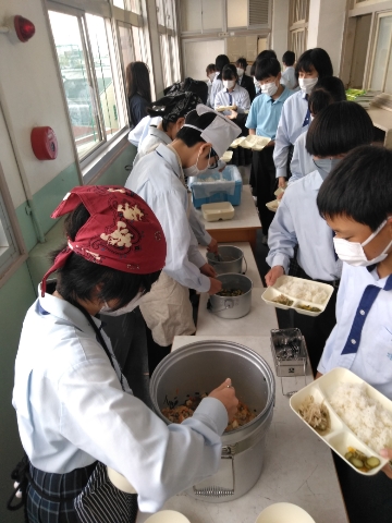 午前中の授業が終了し、給食の準備に入りました。