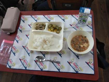 本日のメニューは、人気の麻婆豆腐、きゅうりとコーンの甘酢あえ、もやしとピーマンの胡麻炒めです。
