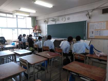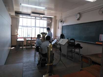 校舎内では、吹奏楽部が楽器ごとに分かれて練習です。