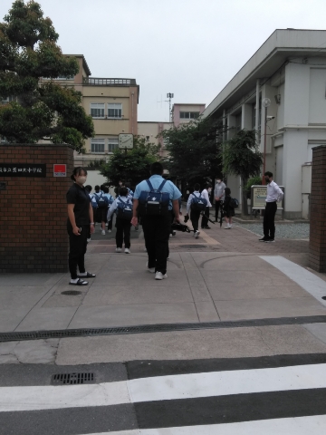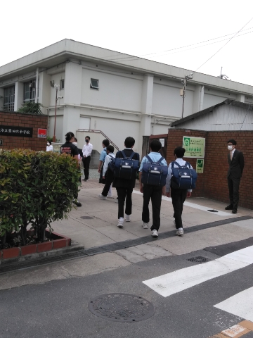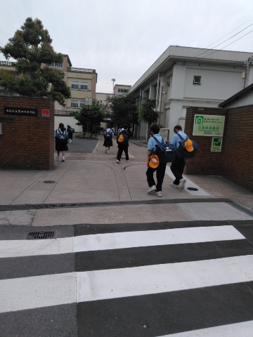 厚い雲が広がる中、生徒たちが元気よく登校して来ました。