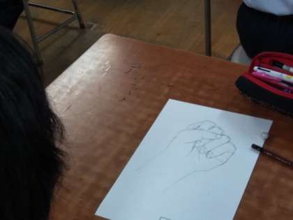 色の濃淡、影、立体感を出すため、しっかり手を見つめています。