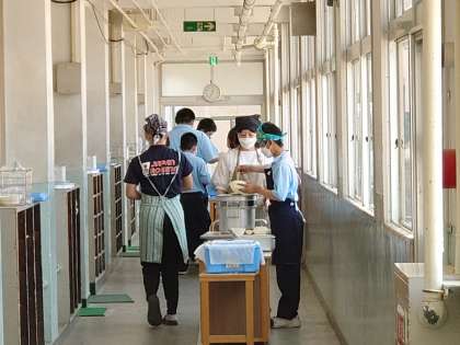 今日の献立は、ごはん、プルコギ、豆腐とわかめのスープ、きゅうりの甘酢づけです。