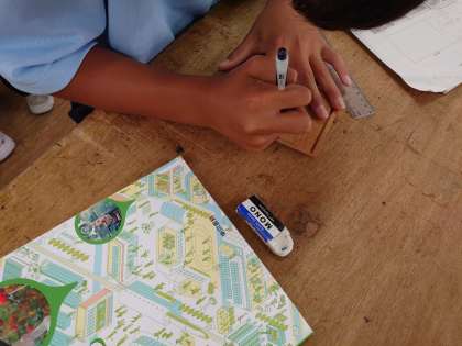 コースターの形をデザインしています。そして、協力しながら、のこぎりを使って形にしています。