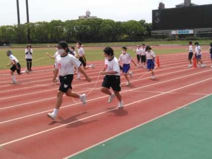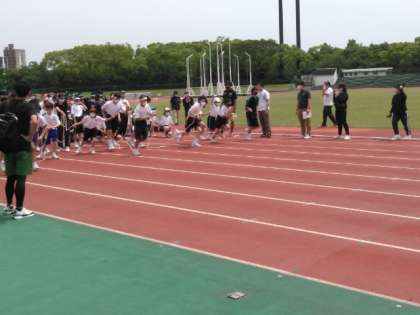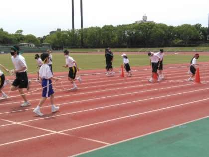 ウォーミングアップのロープリレーが始まりました。